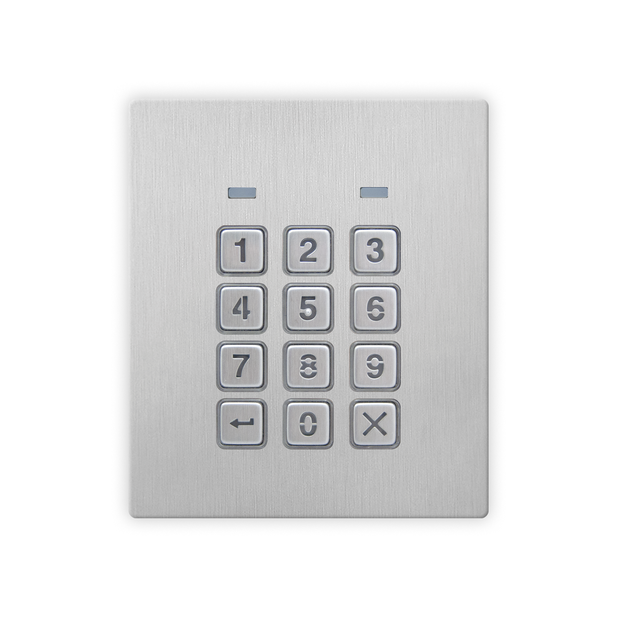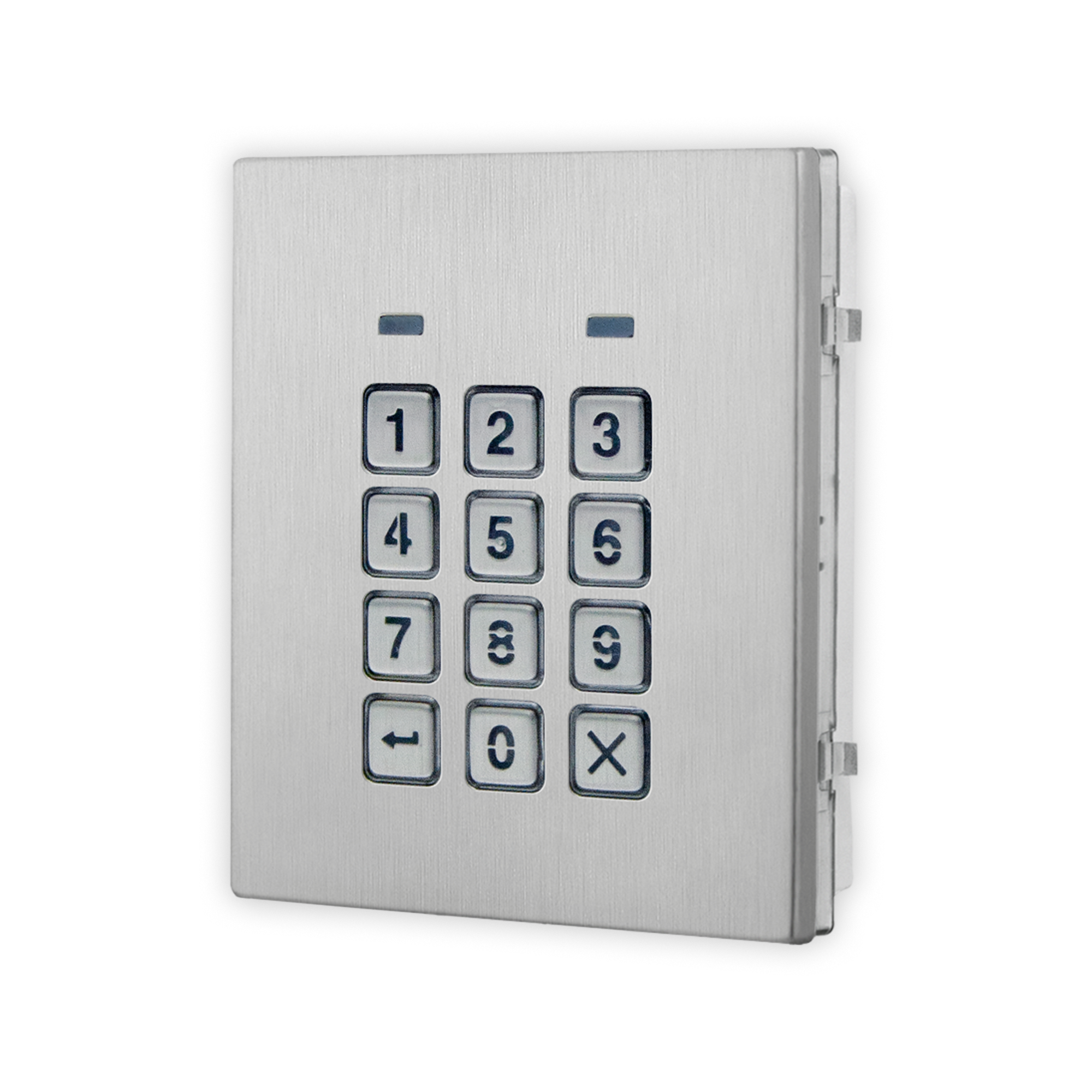 Stand-alone access control module. Backlighting of the 12 buttons with blue LEDs, 2 LEDs for status/operation alerts. 3 relays with contacts C, NC, NO (24V AC/DC - 2A) programmable for temporary activation (01 ... 99 seconds) or for switching operation. Configuration of 3 codes that can be combined with each relay. 2 PTE inputs (active/low) to directly control relays 1 and 2. Acoustic and visual alerts during operation. Vandal resistant plate with IK07 and IP65 protection rating. Operating temperature -20°/+60 °C. Power supply 12/24V AC/DC. Keyboard programming. Dimensions: 103x120x43 mm. Encumbrance 1 module.