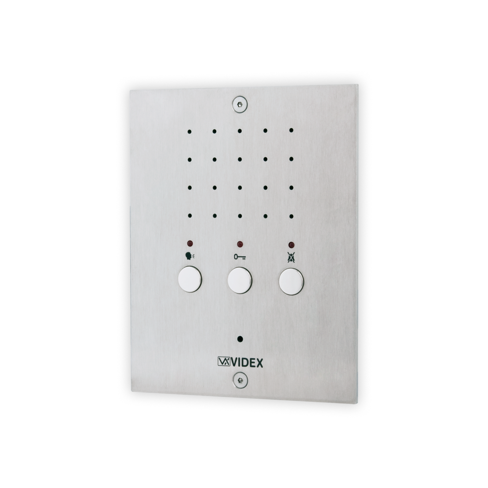 Half duplex hands free intercom with buttons to control “answer/end conversation”, “door open” and “privacy on/off ” (programmable duration). In addition there are 3 LEDs to indicate the status of “answer/end conversation”, “door open/closed” and “privacy on/off”status. Call tone and loudspeaker volume controls are also incorporated on this model.