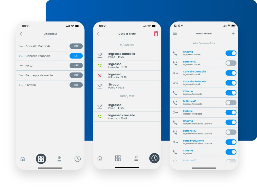 Con l’App Videx non ci sono limiti di dispositivi che puoi controllare. Puoi associare all’App molteplici videocitofoni presenti nello stesso impianto, ad esempio al piano inferiore e quello nel piano superiore, oppure in più impianti distinti, come ad esempio quello della casa principale e quello della casa al mare o dell’ufficio. Nella schermata principale sono visualizzati in automatico tutti i videocitofoni che hai associato all’App potrai comandare le funzioni dei diversi dispositivi, senza dover disconnetterti con logout e poi riconnetterti, e soprattutto non perderai mai nessuna chiamata.