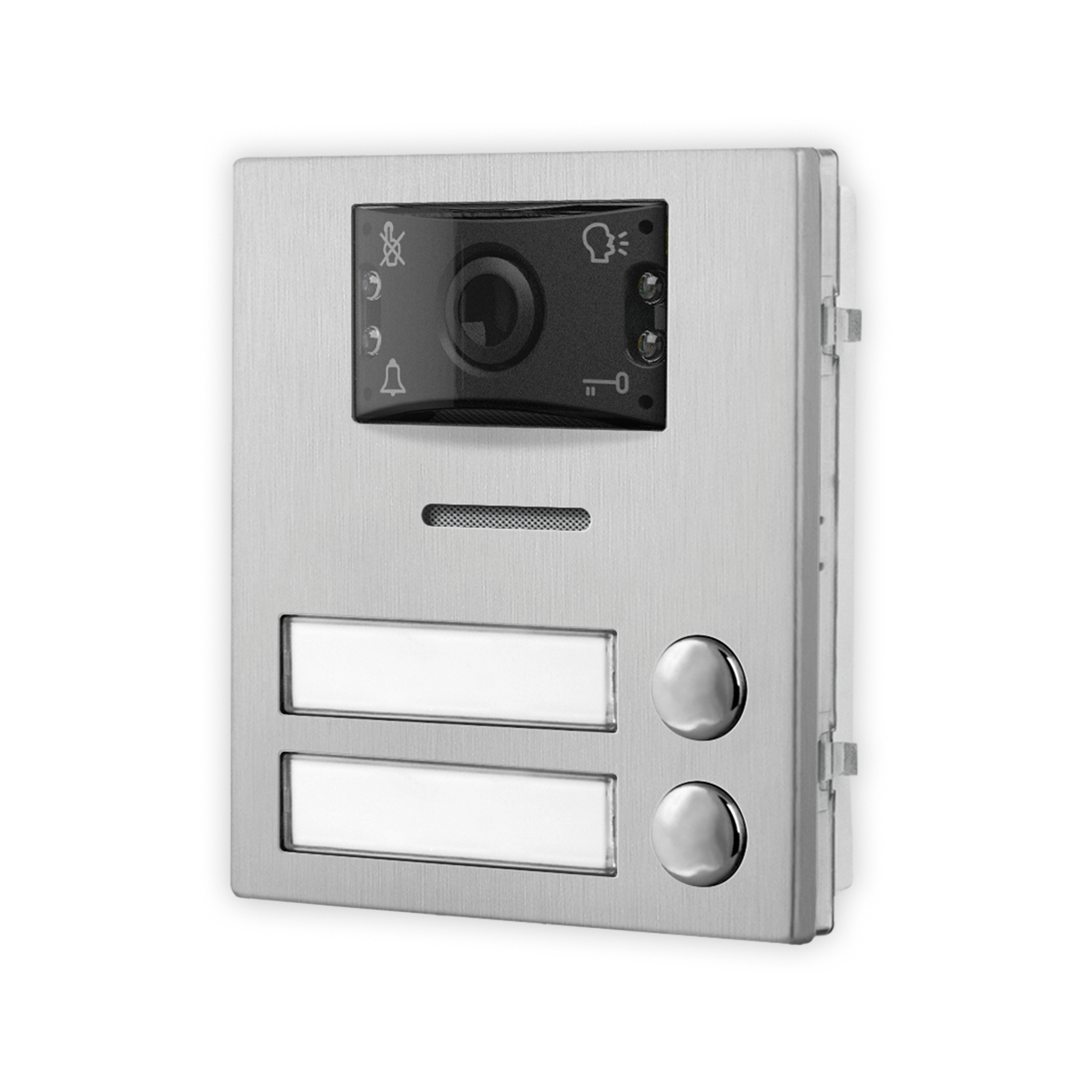 Modulo audio/video a 2 pulsanti serie 4000 per sistema VX2300, telecamera integrata CMOS da 1/4" a colori con sensibilità min 1 Lux e risoluzione da 976x582 (PAL), visione wide angle (V80°-170°H). 4 LED luce bianca per la visione notturna. Microfono ed altoparlante integrato 8Ω/2W e funzione audio full-duplex. Lettore di prossimità RFID integrato (125kHz EM4102) per l'utilizzo fino a 1.000 chiavi di cui fino a 60 programmabili direttamente dal modulo utilizzando la card master in dotazione. Interfaccia BUS-485. Connettore IDC per il collegamento tramite cavo flat (in dotazione) con altri moduli opzionali (massimo 8 moduli per un totale di 42 pulsanti). 4 LED di segnalazione visiva di stato impianto: occupato, chiamata in corso, inizio conversazione ed apertura porta. Segnalazioni acustiche per ipovedenti: inizio conversazione ed apertura porta. Tempo di apertura porta e conversazione configurabili. 1 relè di serie a contatti puliti C-NO-NC (max 24Vac/dc - 2A) con la possibilità di configurare la scarica capacitiva (max 12Vac/dc - 1A) per il pilotaggio diretto della serratura, un'uscita SSR (relè stato solido, max 60Vdc/40Vac - 0,1A) per l'attivazione del secondo cancello ed un ingresso per l'apertura porta diretta (PTE). Livelli del microfono e dell' altoparlante regolabili. Retroilluminazione del cartellino informativo con LED di colore blu. Microfono da alloggiare nel vano specifico dei telai porta moduli che consente una migliore resa fonica anche in ambienti rumorosi azzerando inoltre eventuali problemi di effetto larsen. Placca in acciaio inox satinato AISI 316 (marine grade) che conferisce durabilità in installazioni soggette ad agenti atmosferici e in prossimità di ambienti marini. Placca antivandalica IK07 e grado di protezione IP65. Temperatura di esercizio -20°/+60°C. Alimentazione da BUS. Configurazione semplificata del dispositivo attraverso dip-switch oppure kit di programmazione cod. 2209. Dimensioni 103x120x43mm. Ingombro 1 modulo.