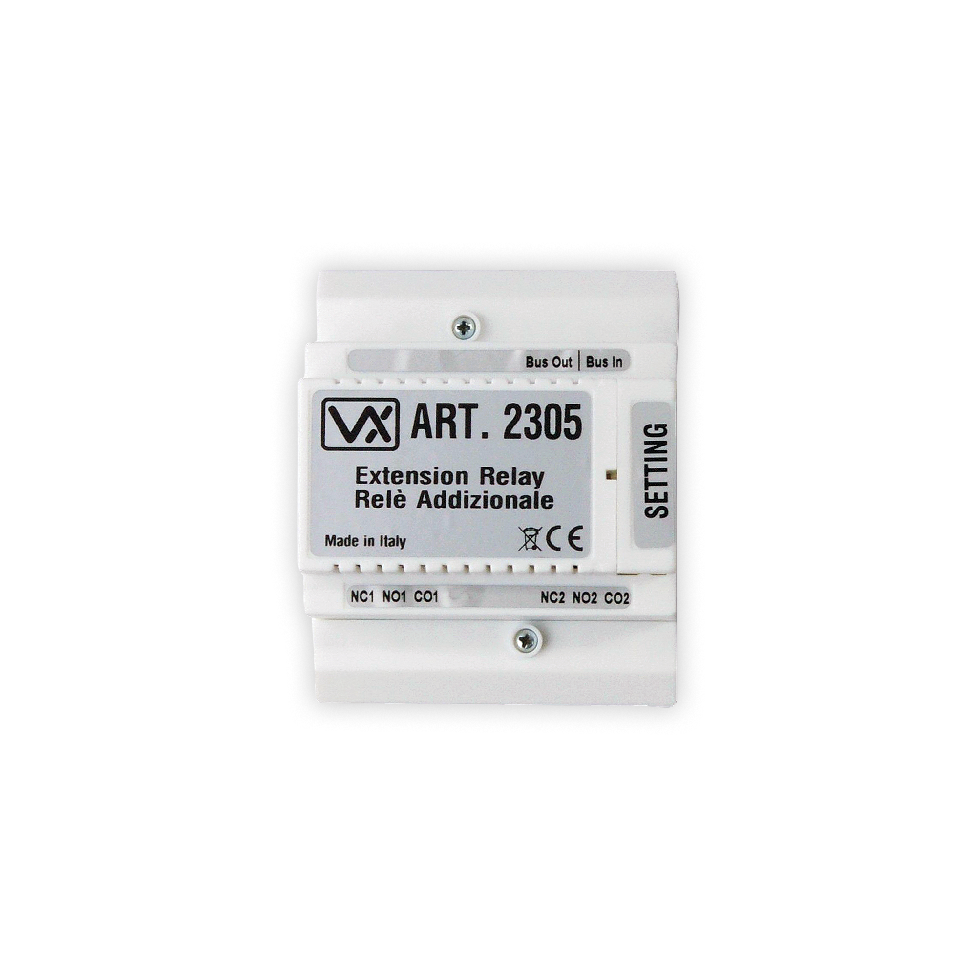 | Descrizione | Relè bus/suoneria addizionale. L'Art. 2305 ha due relè integrati e possono essere collegati direttamente al BUS a 2 fili. L'unità ha due modalità di funzionamento BUS Relè per dispositivi ausiliari o come relè suoneria addizionale. |