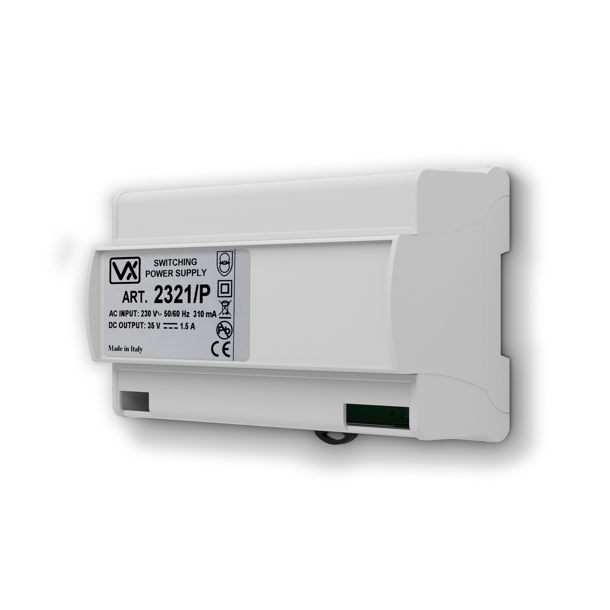 Alimentatore audio/video per sistema VX2300 ad alte prestazioni, fino a 4 ingressi e massimo 50 utenti in montante. Alimentazione 230Vac - 50Hz, tensione di uscita 35Vdc/1,5A. Installazione a parete oppure su guida DIN (9 moduli). Dimensioni: 160,3x96,8x62,5mm.