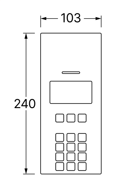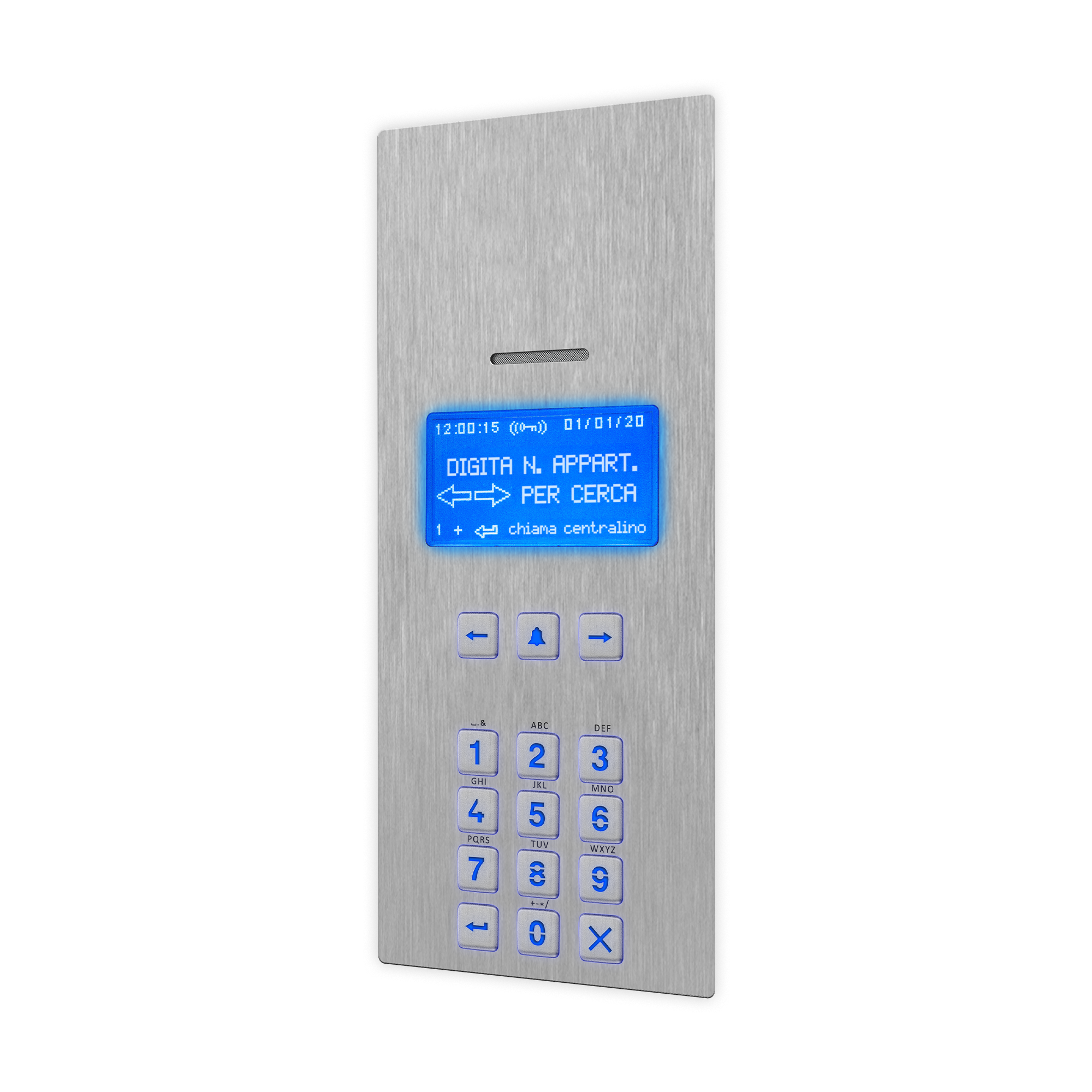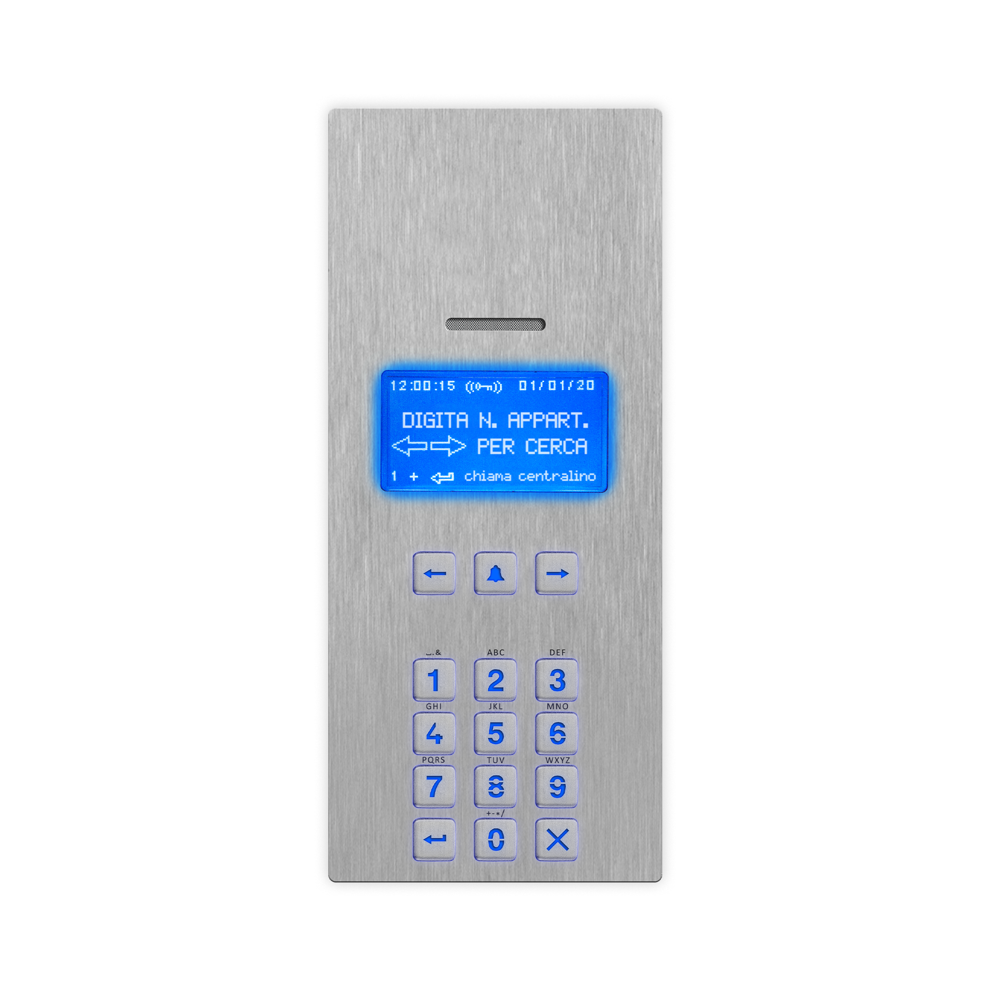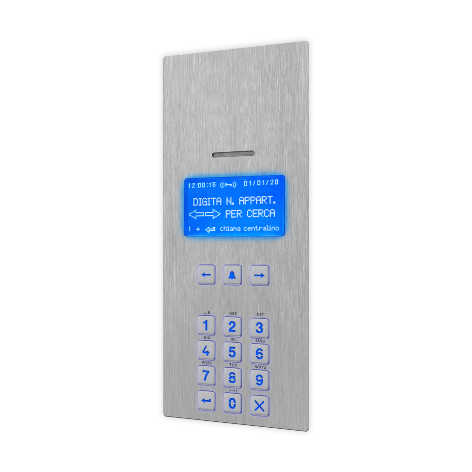Targa audio con rubrica elettronica e tastiera numerica serie 4000 per sistema VX2300 con display grafico e tastiera antivandalica con retroilluminazione LED di colore blu. Microfono ed altoparlante integrato 8Ω/2W con funzione audio full-duplex. Segnalazione su display ed acustiche per ipovedenti dello stato impianto: occupato, chiamata in corso, inizio conversazione e apertura porta. Repertorio fino a 3200 contatti selezionabili da tastiera alfa numerica e visualizzabile da display. Funzione controllo accessi disponibile da tastiera o da lettore di prossimità integrato NFC/MIFARE per l’attivazione del relè apriporta. Interfaccia Wiegand fino a 34 bit. Programmazione del tempo di apertura porta e conversazione. Log interno per gli eventi. 2 relè di serie a contatti puliti C-NO-NC (max 24Vac/dc - 2A) con la possibilità di configurare la scarica capacitiva (max 12Vac/dc - 2A) per il pilotaggio diretto della serratura, 2 ingressi di serie programmabili (PTE) ed abilitazione funzione TRADE. 1 porta bus RS-485 ed USB uso programmazione e/o connessione accessori. Livelli volume microfono/altoparlante e contrasto display regolabili senza potenziometri. Microfono da alloggiare nel vano specifico dei telai porta moduli che consente una migliore resa fonica anche in ambienti rumorosi azzerando inoltre eventuali problemi di effetto larsen. Placca in acciaio inox satinato AISI 316 (marine grade) che conferisce durabilità in installazioni soggette ad agenti atmosferici e in prossimità di ambienti marini. Placca antivandalica IK09 e grado di protezione IP65. Temperatura di esercizio -20°/+60°C. Alimentazione da BUS. Configurazione semplificata del dispositivo attraverso software cod. 2208. Dimensioni 103x240mm. Ingombro 2 moduli.