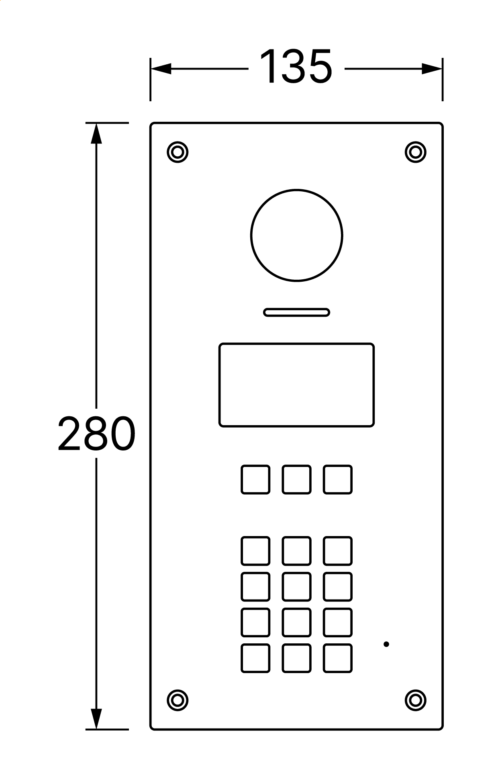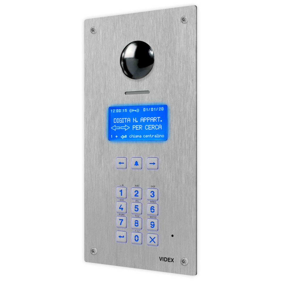 Targa audio/video con rubrica elettronica e tastiera numerica serie FLUSH per sistema VX2300 con display grafico e telecamera integrata CMOS da 1/4” a colori con sensibilità min 1 Lux e risoluzione da 976x582 (PAL), visione wide angle (V80°-170°H). 4 LED luce bianca per la visione notturna. Tastiera antivandalica con retroilluminazione LED di colore blu. Microfono ed altoparlante integrato 8Ω/2W con funzione audio full-duplex. Segnalazione su display ed acustiche per ipovedenti dello stato impianto: occupato, chiamata in corso, inizio conversazione e apertura porta. Repertorio fino a 3200 contatti selezionabili da tastiera alfa numerica e visualizzabile da display. Funzione controllo accessi disponibile da tastiera o da lettore di prossimità integrato NFC/MIFARE per l’attivazione del relè apriporta. Interfaccia Wiegand fino a 34 bit. Programmazione del tempo di apertura porta e conversazione. Log interno per gli eventi. 2 relè di serie a contatti puliti C-NO-NC (max 24Vac/dc - 2A) con la possibilità di configurare la scarica capacitiva (max 12Vac/dc - 2A) per il pilotaggio diretto della serratura, 2 ingressi di serie programmabili (PTE) ed abilitazione funzione TRADE. 1 porta bus RS-485 ed USB uso programmazione e/o connessione accessori. Livelli volume microfono/altoparlante e contrasto display regolabili senza potenziometri. Placca in acciaio inox satinato AISI 316 (marine grade) che conferisce durabilità in installazioni soggette ad agenti atmosferici e in prossimità di ambienti marini. Placca antivandalica IK09 e grado di protezione IP65. Temperatura di esercizio -20°/+60°C. Alimentazione da BUS. Configurazione semplificata del dispositivo attraverso software cod. 2208. Dimensioni placca 135x280x47mm. Scatola da incasso inclusa, dimensioni 120x263x45mm. Non richiede accessori di installazione.