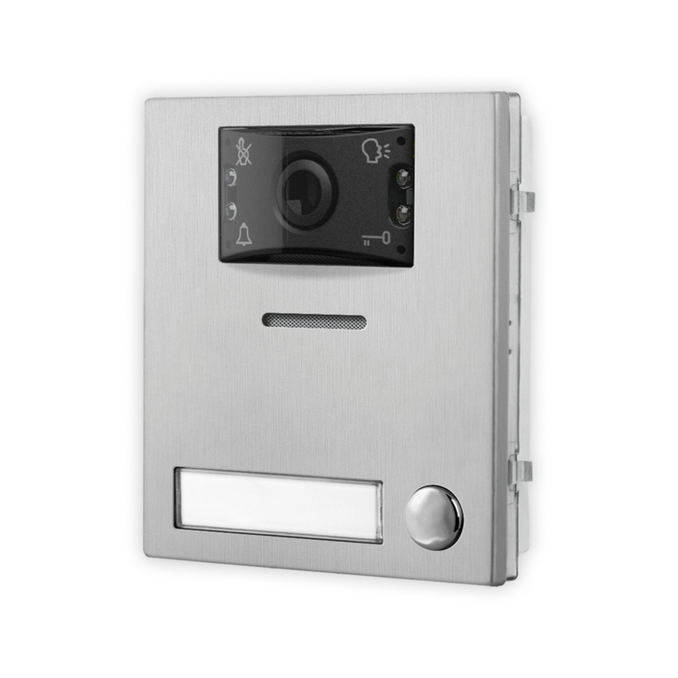 Modulo audio/video a 1 pulsante serie 4000 per sistema IPure compreso di telecamera autoiris CMOS da 1/4" a colori con sensibilità 3.3V/lux-sec@550nm (min 0.1lux) e risoluzione da 1280x720(720p/1Mpx) /640x480(VGA)/352x288(CIF)/320x240(QVGA)/176x144(QCIF), framerate @30ips. Visione wide angle (V80°x170°H). Codec video H.264/H.263+/H.263, protocollo video RTP/RTSP. 4 LED luce bianca per la visione notturna. 1 microfono integrato, 1 altoparlante integrato 8Ω/2W, amplificatore in classe D da 1W. Funzione audio full-duplex (AEC) con riduzione digitale del rumore/disturbo. Codec audio G711 µ-law/A-law, protocollo audio Videx IPure/RTP. Frequenza di campionamento 8kHz. Lettore di prossimità RFID integrato (125kHz: EM4100/EM4102) per l'utilizzo fino a 10.000 chiavi cod. 955/T oppure card ISO3, la configurazione chiavi avviene attraverso PC utilizzando software IPure Wizard. Interfaccia Wiegand (34 bit programmabile). Connettore IDC per il collegamento tramite cavo flat (in dotazione) con altri moduli opzionali (massimo 8 moduli per un totale di 42 pulsanti). 4 LED di segnalazione visiva di stato impianto: occupato, chiamata in corso, comunicazione aperta e apertura porta. Segnalazioni acustiche per ipovedenti: comunicazione aperta e apertura porta. Programmazione configurabile del tempo di apertura porta e conversazione. Programmazione configurabile del tempo apertura porta e conversazione. 2 relè di serie a contatti puliti C-NO-NC (max 24Vac/dc - 2A), 2 ingressi di serie programmabili (PTE). 1 porta bus RS-485. Livelli del microfono e dell' altoparlante regolabili. Retroilluminazione del cartellino informativo con LED di colore blu. Microfono da alloggiare nel vano specifico dei telai porta moduli che consente una migliore resa fonica anche in ambienti rumorosi azzerando inoltre eventuali problemi di effetto larsen. Protocollo proprietario Videx IPure/CloudNected. Multi-compatibilità con protocolli: SIP 2.0 (UDP), 802.1x, RTP, RTSP, HTTP. Placca in acciaio inox satinato AISI 316 (marine grade) che conferisce durabilità in installazioni soggette ad agenti atmosferici e in prossimità di ambienti marini. Placca antivandalica IK07 e grado di protezione IP65. Temperatura di esercizio -20°/+60°C. Alimentazione PoE 802.3af (Classe 0 - 12.95W) oppure 12Vdc ± 15%/400mA. Porta LAN RJ45 10/100 BASE-TX con Auto-MDIX, cavo raccomandato Cat-5 o superiori. Configurazione semplificata del dispositivo attraverso software IPure Wizard. Dimensioni 103x120x43mm. Ingombro 1 modulo.