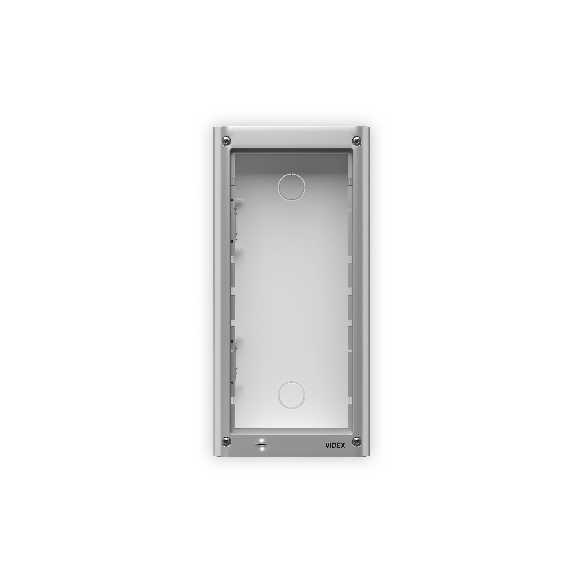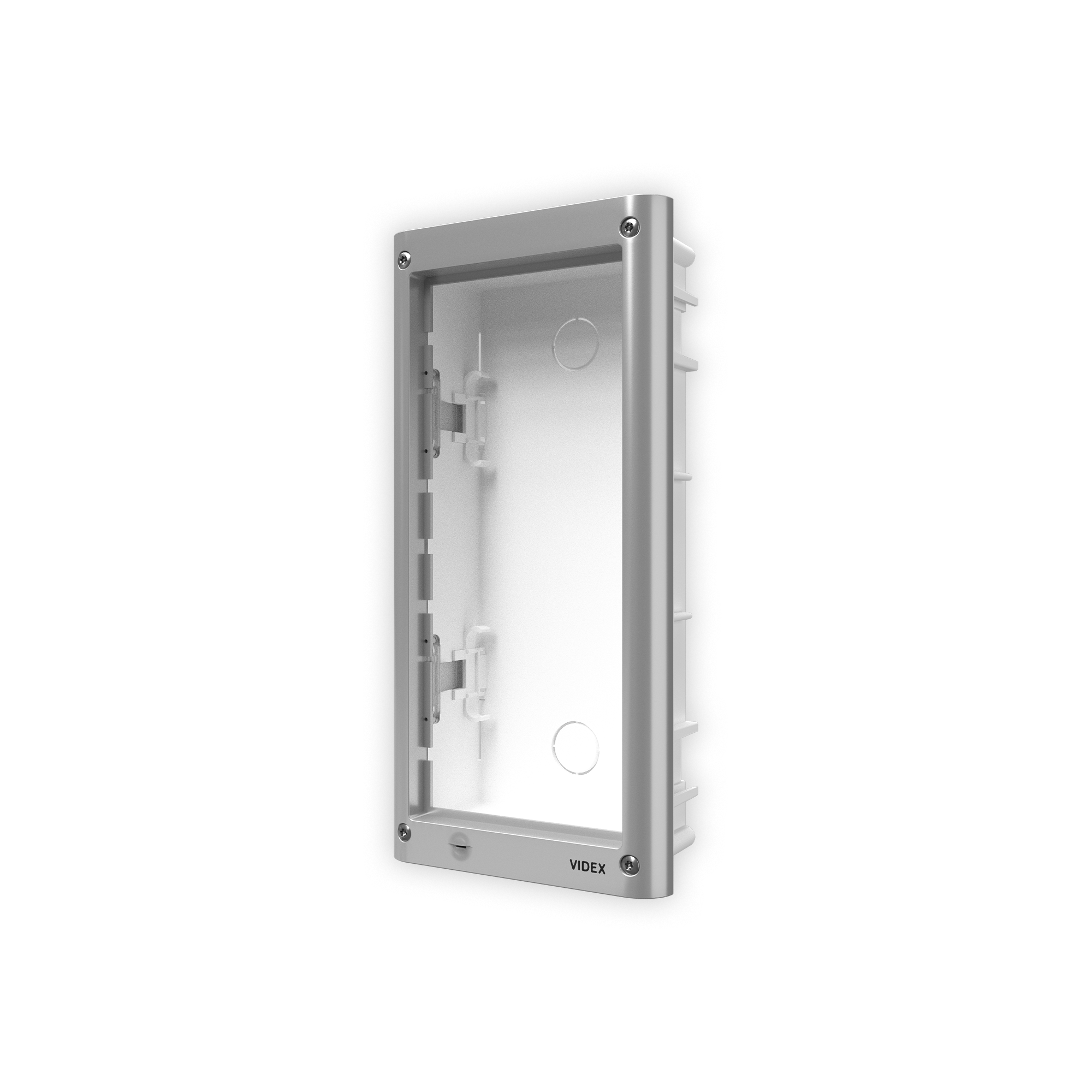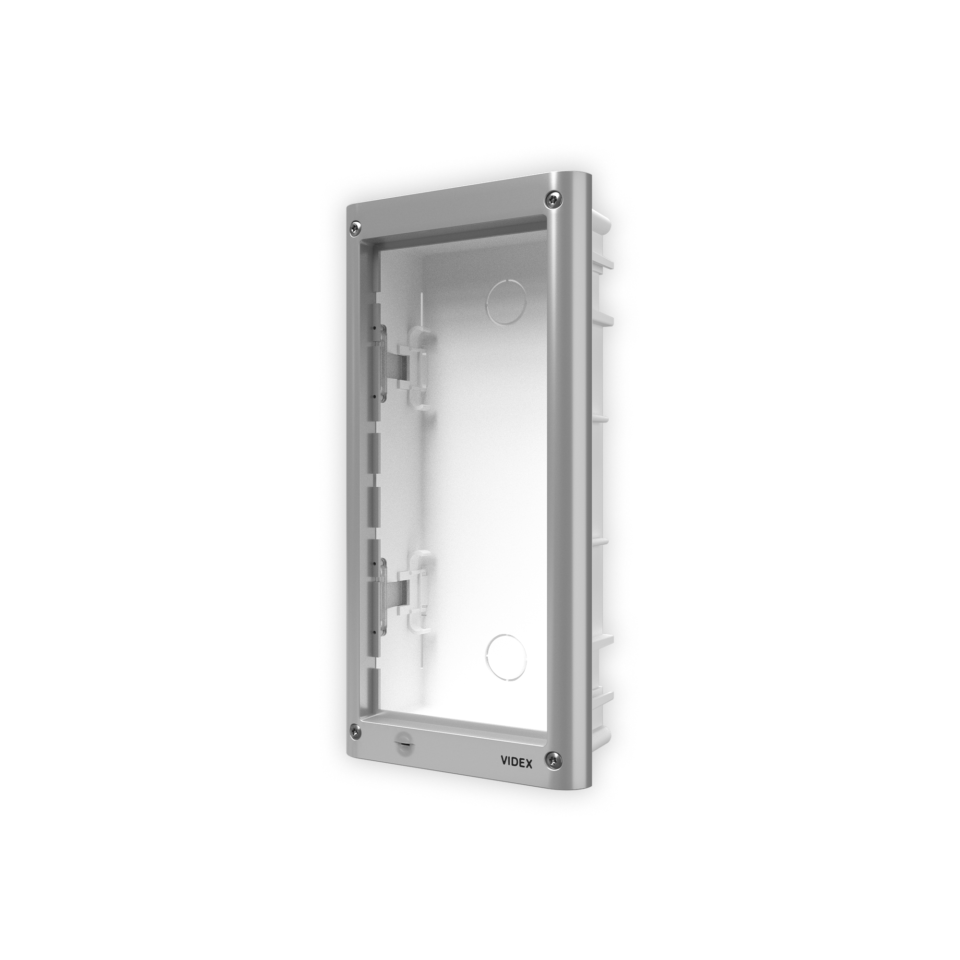 Composto da: scatola da incasso e telaio portamoduli. Il telaio comprende 4 viti di sicurezza tipo Torx, una guarnizione anti-infiltrazioni e cerniere laterali per consentire l’apertura del telaio per l’installazione o ispezione. Dimensione scatola: 120x263x45mm, dimensione telaio: 135x280x17mm, colore grigio alluminio.