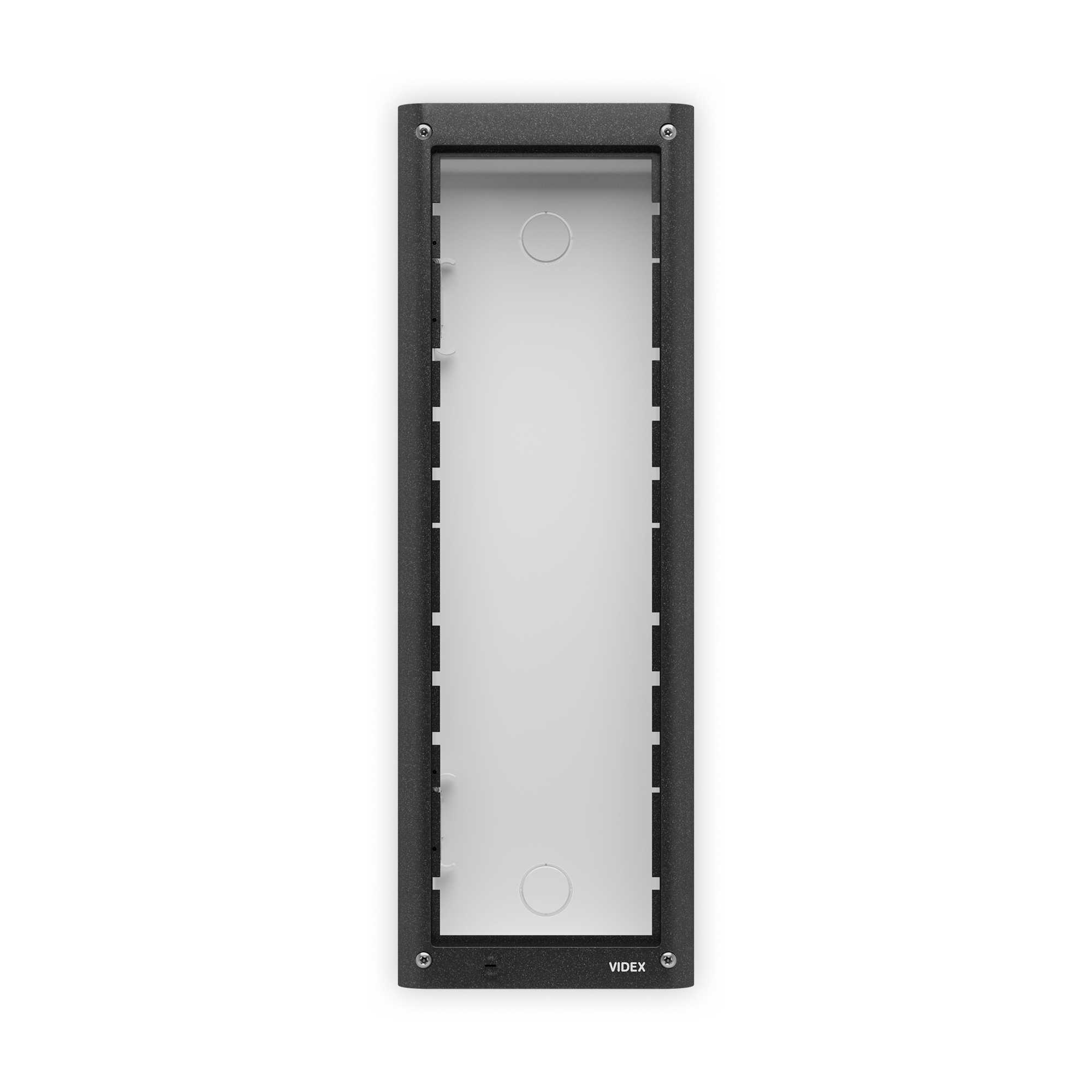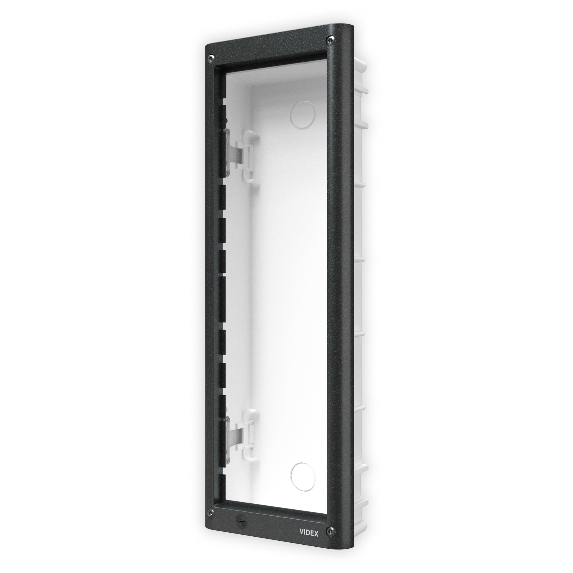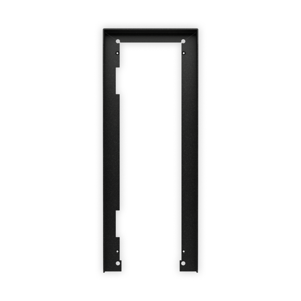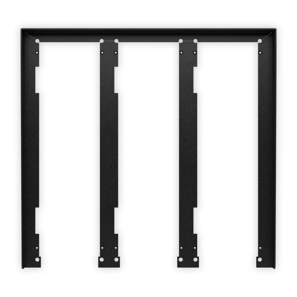 Composto da: scatola da incasso e telaio portamoduli. Il telaio comprende 4 viti di sicurezza tipo Torx, una guarnizione anti-infiltrazioni e cerniere laterali per consentire l’apertura del telaio per l’installazione o ispezione. Dimensione scatola: 120x383x45mm, dimensione telaio: 135x400x17mm, colore grigio canna di fucile.