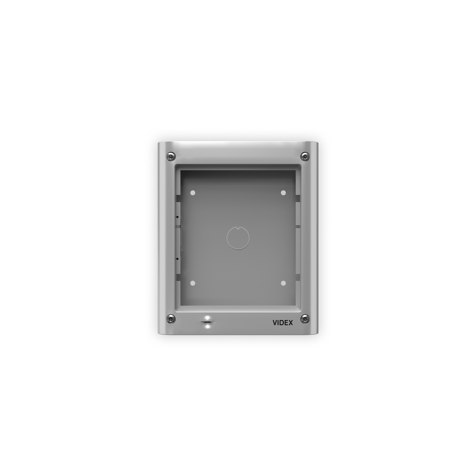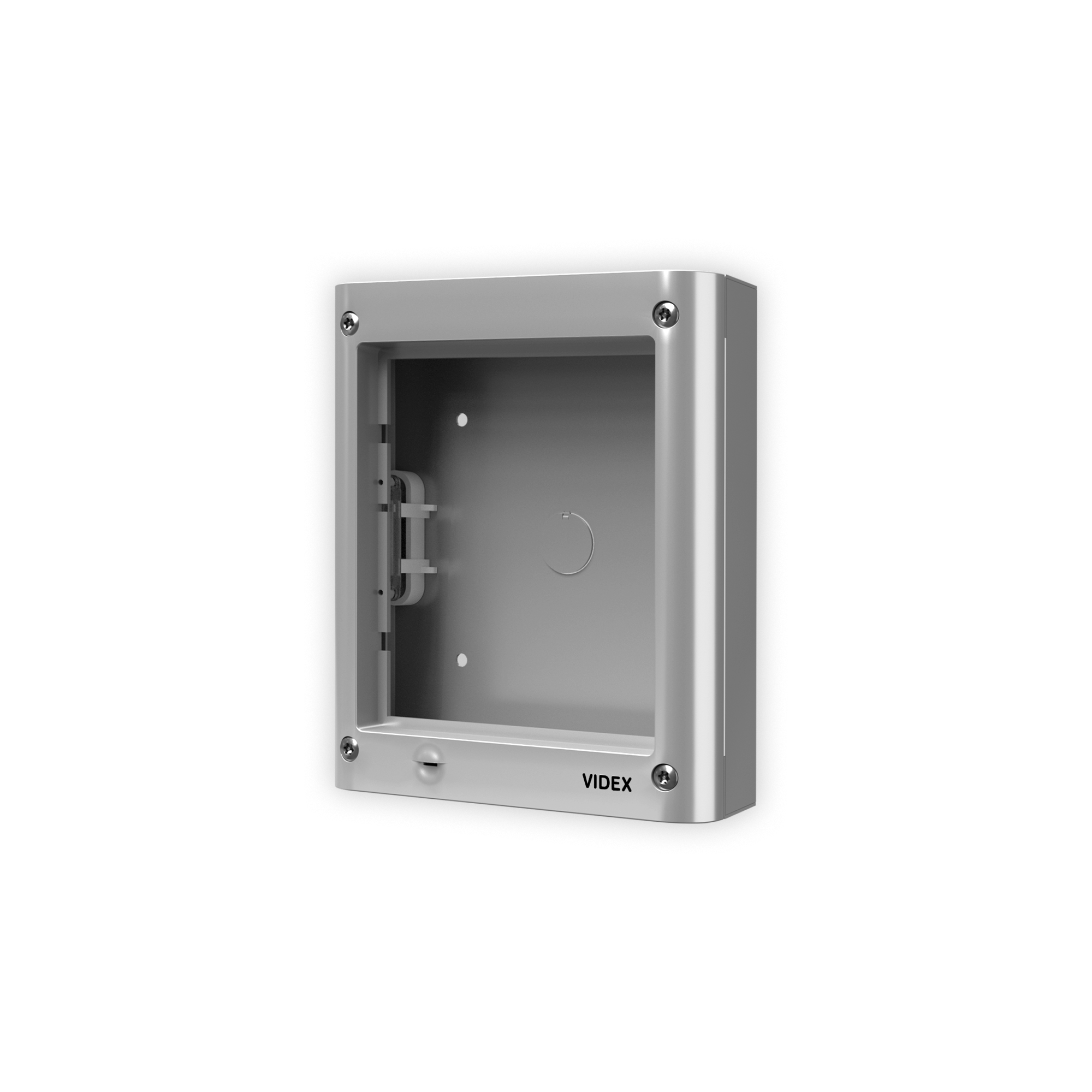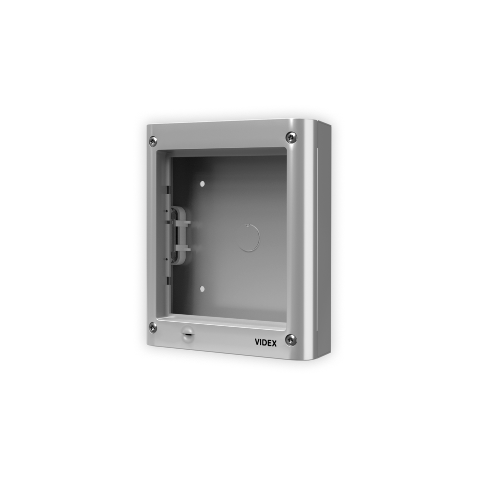 Composto da: scatola da superficie e telaio portamoduli. Il telaio comprende 4 viti di sicurezza tipo Torx, una guarnizione anti-infiltrazioni e cerniere laterali per consentire l’apertura del telaio per l’installazione o ispezione. Dimensioni 135x160x44mm, colore grigio alluminio.