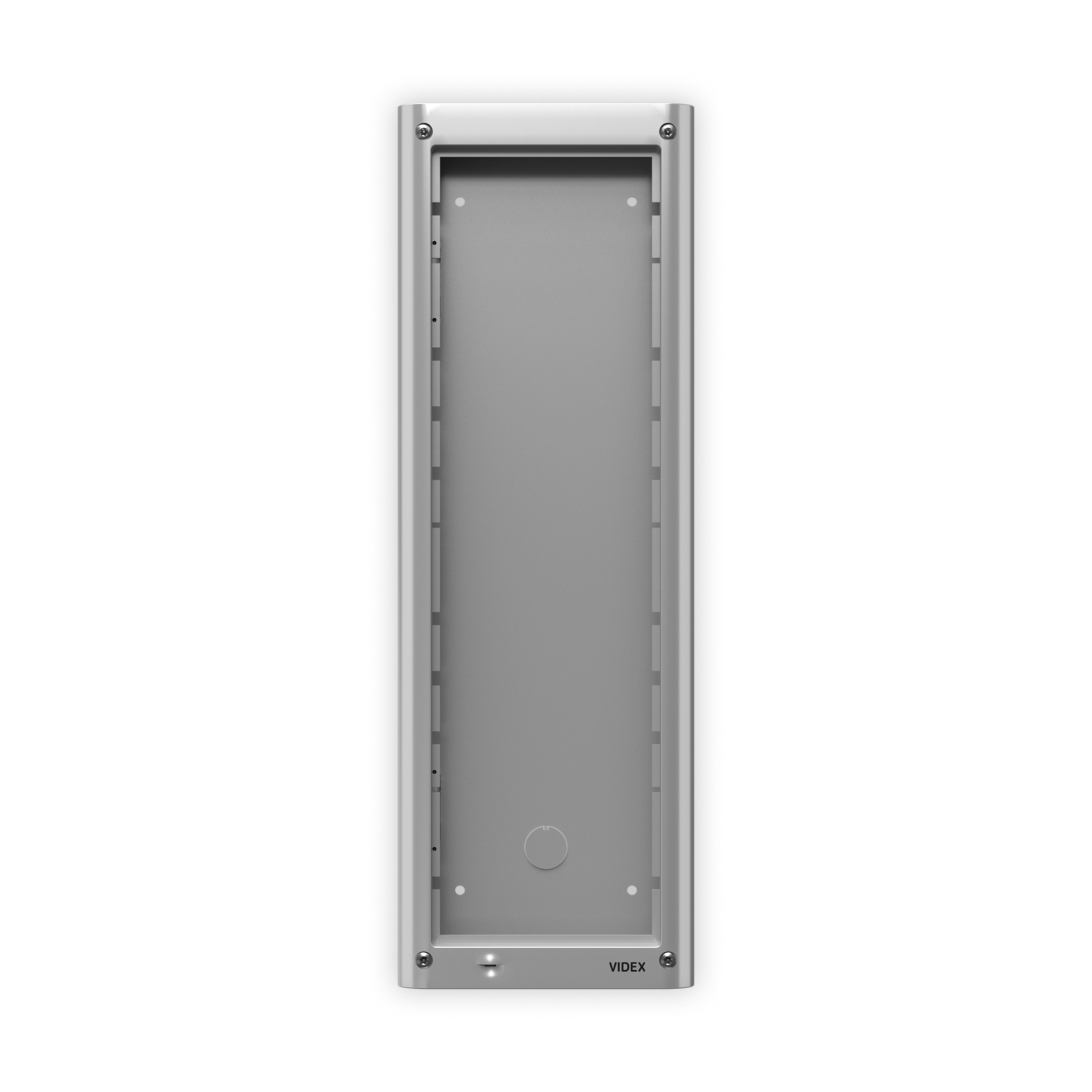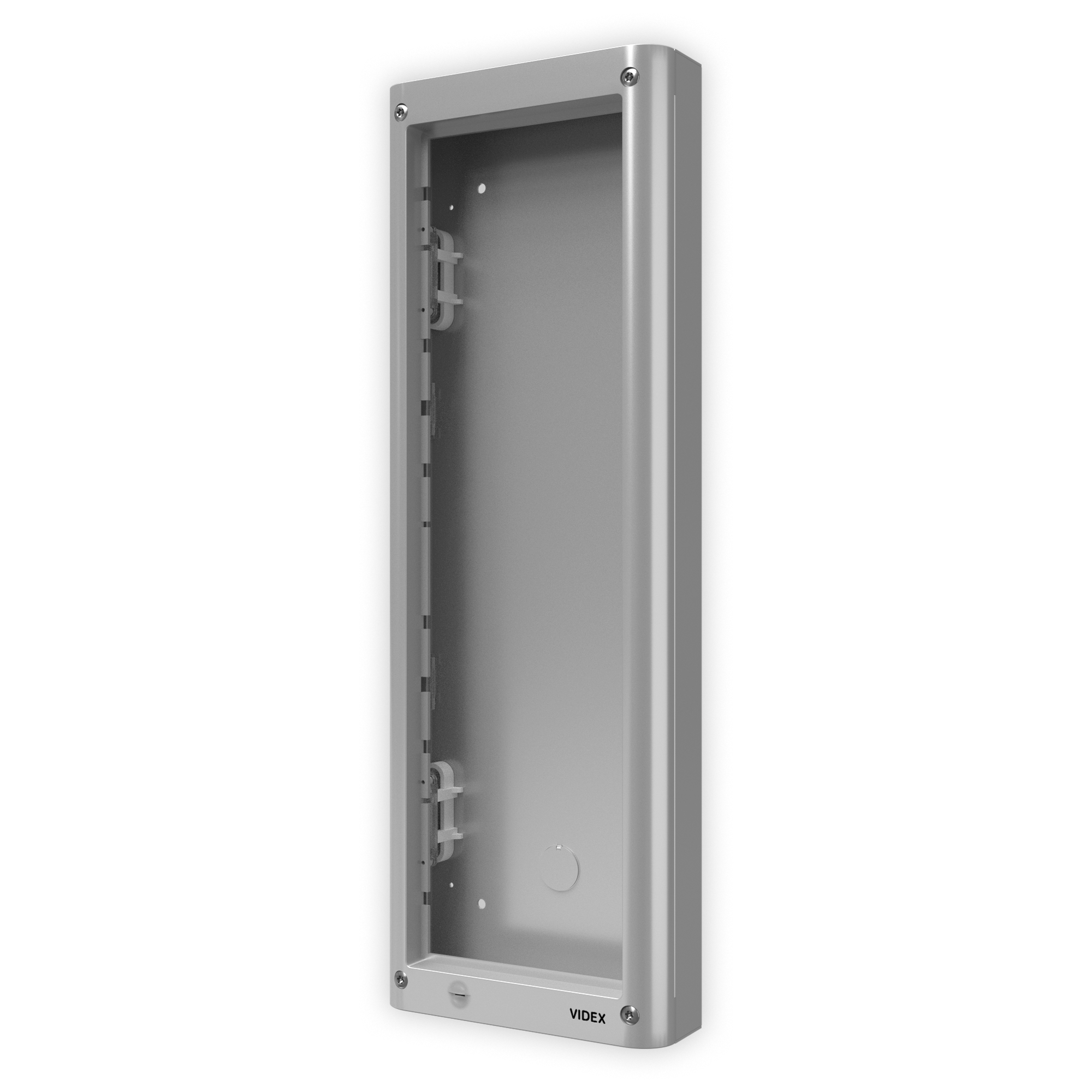 Composto da: scatola da superficie e telaio portamoduli. Il telaio comprende 4 viti di sicurezza tipo Torx, una guarnizione anti-infiltrazioni e cerniere laterali per consentire l’apertura del telaio per l’installazione o ispezione. Dimensioni 135x400x44mm, colore grigio alluminio.