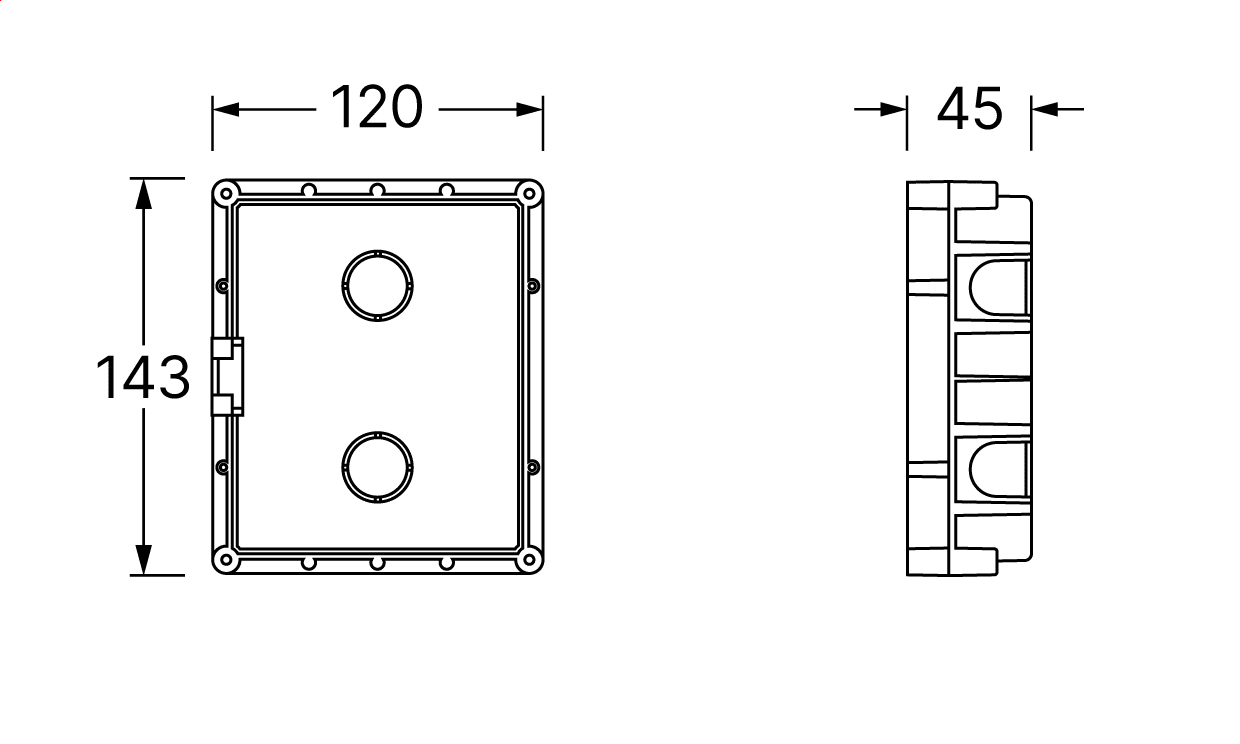 Scatola da incasso a 1 modulo, dimensioni: 120x143x45mm.
