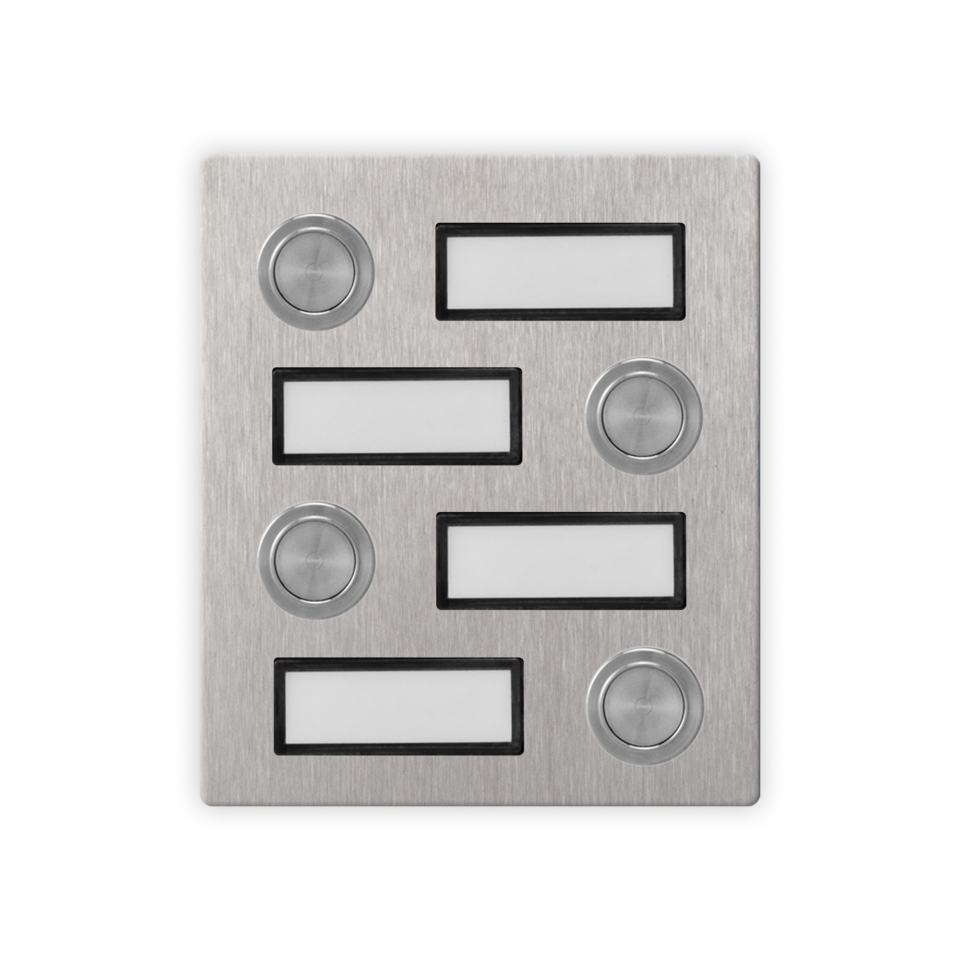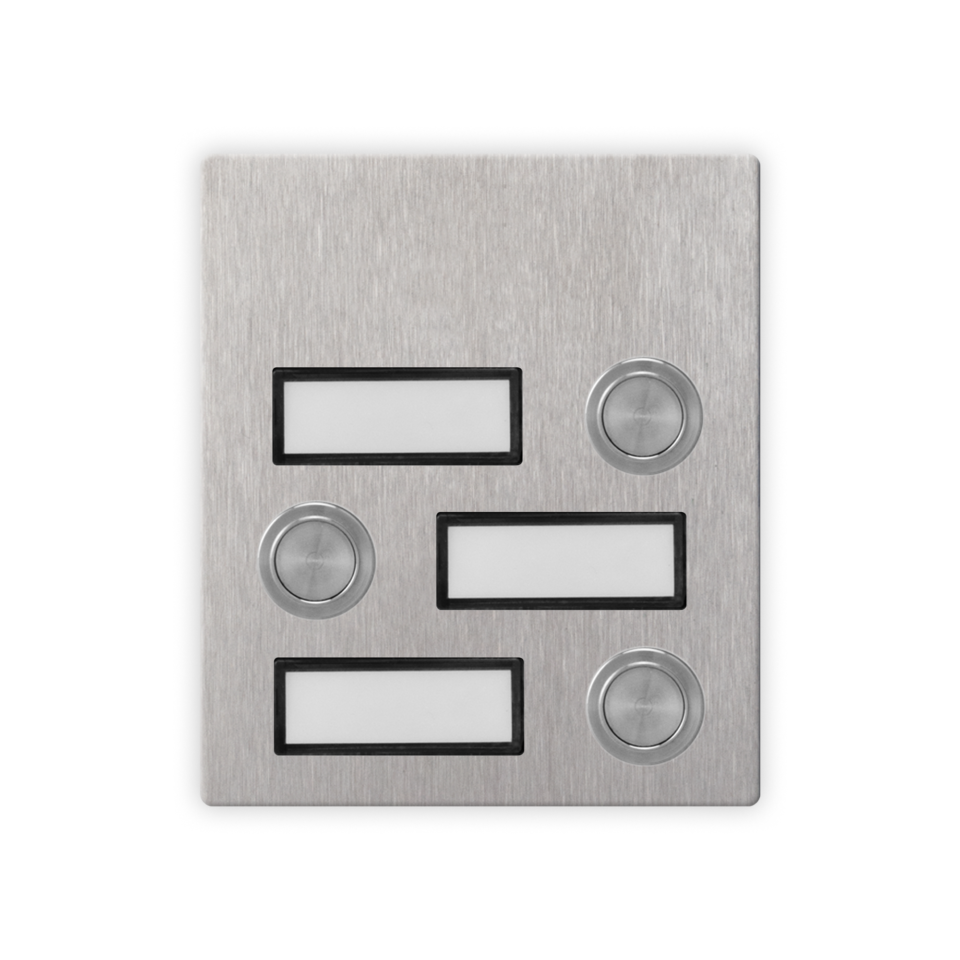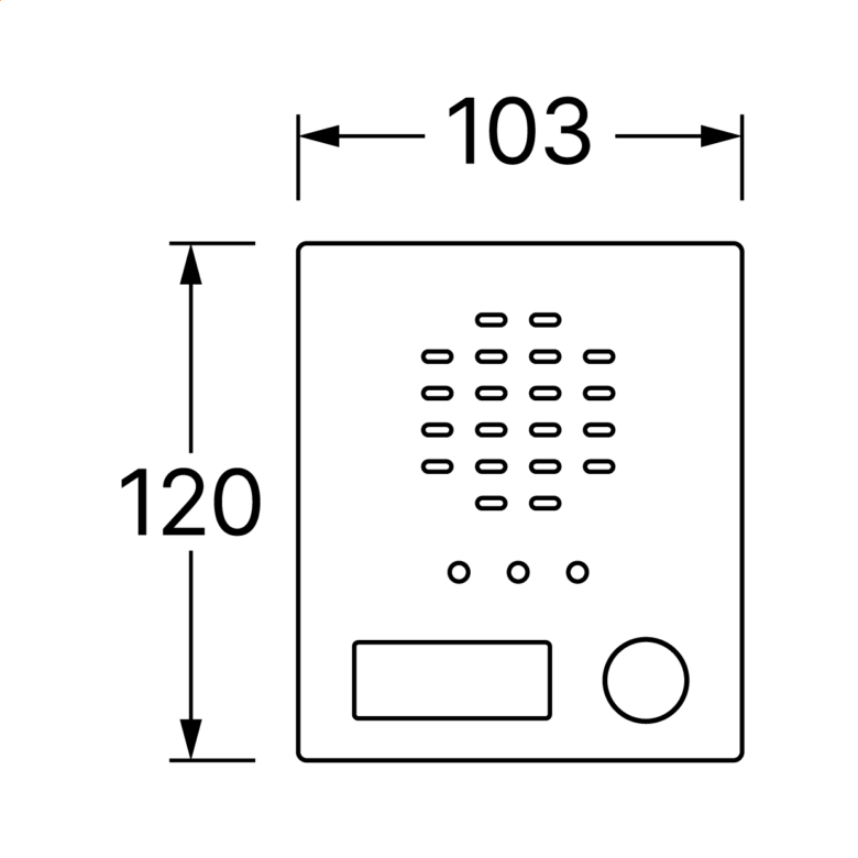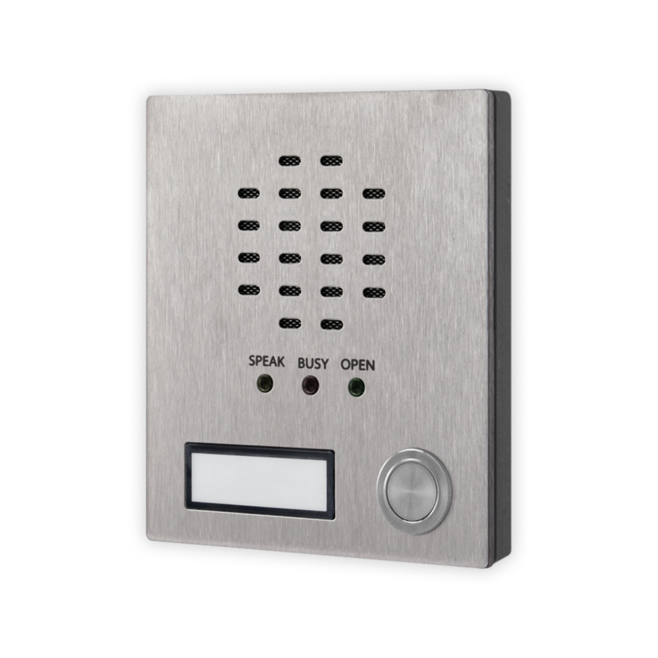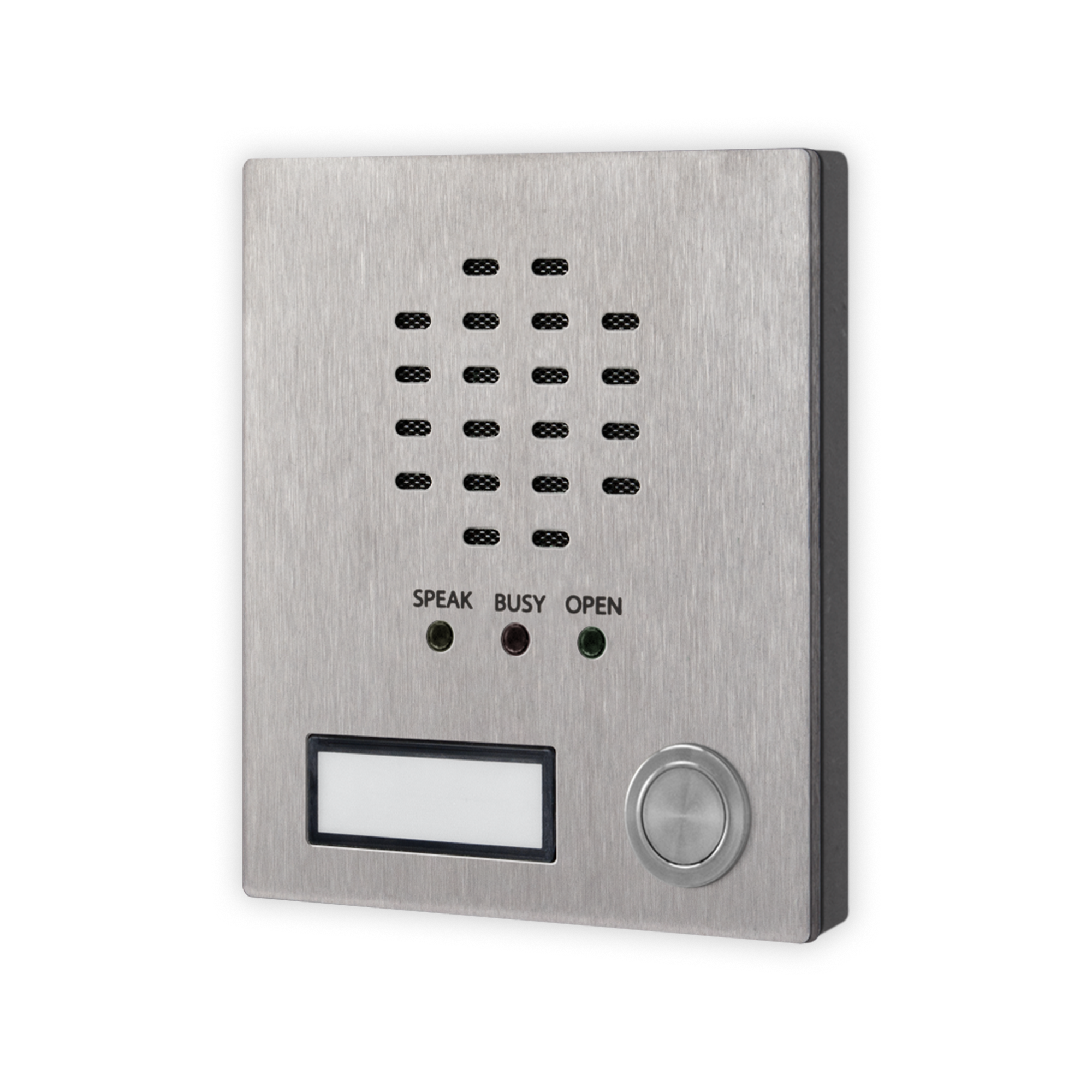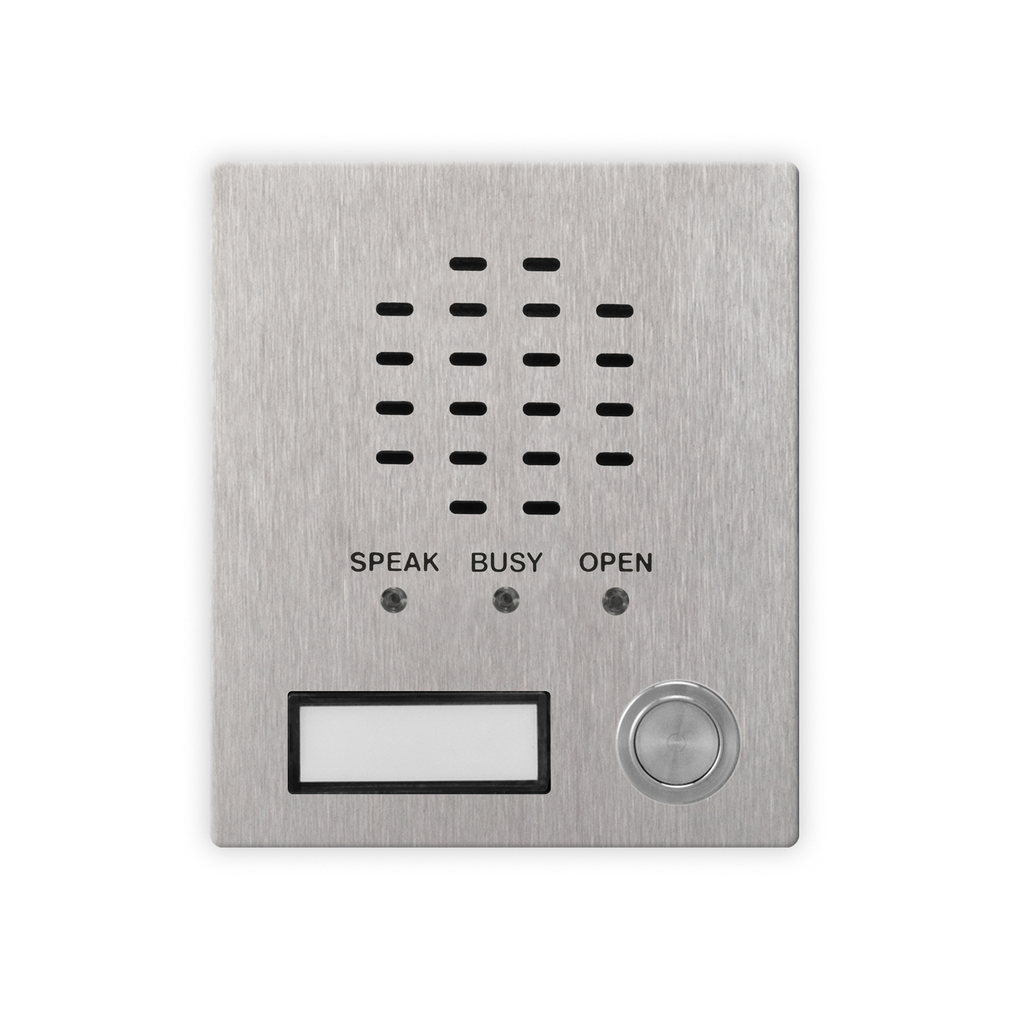 Modulo audio a 1 pulsante con cartellino portanome serie 4000 IK09 per sistema GSM, connessione 4G/3G/2G, 1 microfono integrato, 1 altoparlante integrato 8Ohm/2W, amplificatore in classe D da 1W. Funzione audio full-duplex (AEC) con riduzione digitale del rumore/disturbo. Possibilità di collegare in locale un pulsante apriporta. Connessione tramite morsettiera di moduli pulsanti opzionali per un totale di 24 pulsanti. 3 LED di segnalazione visiva di stato impianto: occupato, comunicazione aperta e apertura porta. Tempo di apertura porta e conversazione configurabili. 1 relè di serie a contatti puliti C-NO-NC (max 24Vac/dc - 2A), 1 uscita open collector, 2 ingressi ausiliari. Livelli del microfono e dell’altoparlante regolabili. Microfono da alloggiare nel vano specifico dei telai porta moduli che consente una migliore resa fonica anche in ambienti rumorosi azzerando inoltre eventuali problemi di effetto larsen. 4 numeri telefonici (1 primario, 3 deviazioni) da abbinare ad ogni pulsante di chiamata/utenza. Fino a 1.000 utenti con funzione dial to open (chiama per aprire). 4.000 log eventi in locale ed illimitati con accesso da remoto. Placca in acciaio inox spazzolato AISI 316 (marine grade) che conferisce durabilità in installazioni soggette ad agenti atmosferici e in prossimità di ambienti marini. Placca antivandalica IK09 e grado di protezione IP65. Temperatura di esercizio -20°/+60°C. Alimentazione 12Vcc / 12Vac ± 10%/400mA. Configurazione semplificata del dispositivo attraverso software GSMPRO in locale o remoto, oppure attraverso SMS. Necessita di installazione antenna cod.434. Dimensioni 103x120x43mm. Ingombro 1 modulo.