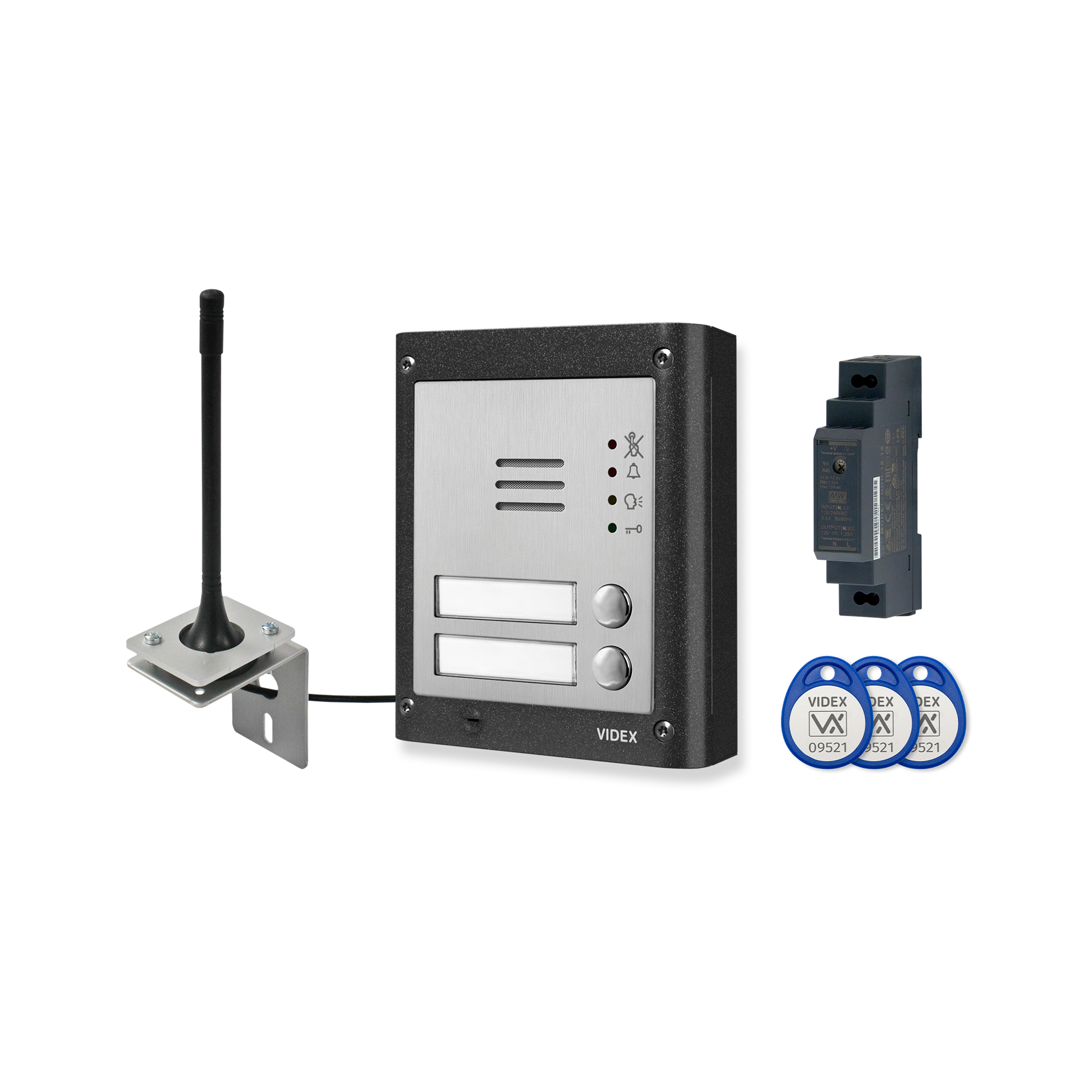 Kit citofonico senza fili, bifamiliare da superficie, sistema GSM, soluzione espandibile composta da: 1 pz. 4810/4G-2/M, 1 pz. 4881, 1 pz. 434, 3 pz. 955/T, 1 pz. HDR-15-12.