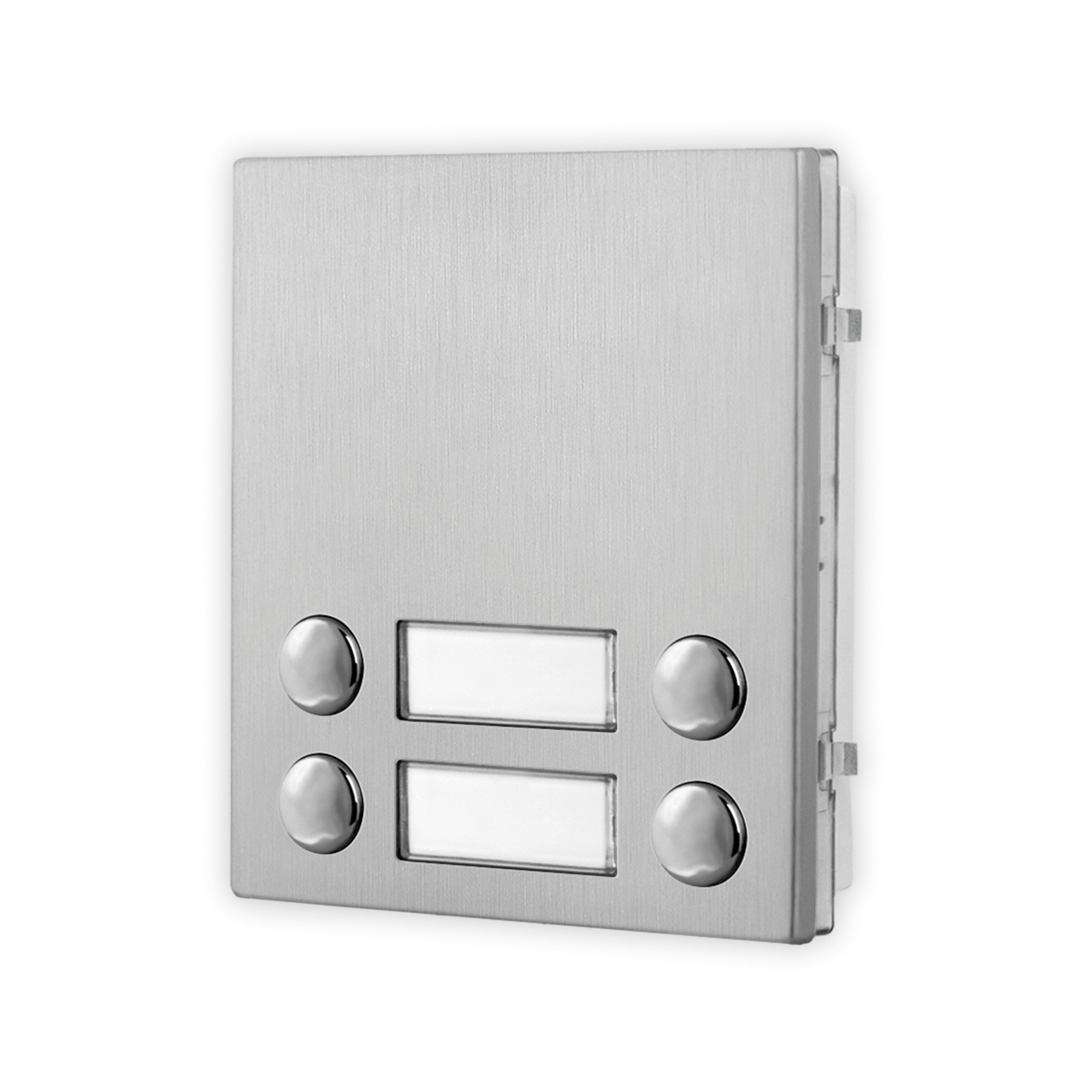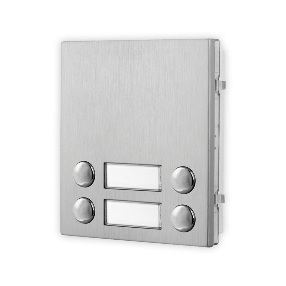 Módulo de botões de chamada a 4 botões dispostos nas duas filas série 4000 para sistemas IPure, VX2300 e GSM. Retroiluminação dos porta-nomes com LED de cor azul. Conector IDC para a ligação por meio de “Flat Cable” (fornecido) com outros módulos opcionais (máximo 8 módulos para um total de 42 botões). Placa de aço inox acetinado AISI 316 (grau maritímo) que confere durabilidade em instalações sujeitas a agentes atmosféricos e nas proximidades de ambientes marinhos. Placa à prova de vandalismo IK07 e grau de proteção IP65. Temperatura de trabalho -20°/+60°C. Dimensões 103x120x43mm. Dimensão externa 1 módulo.